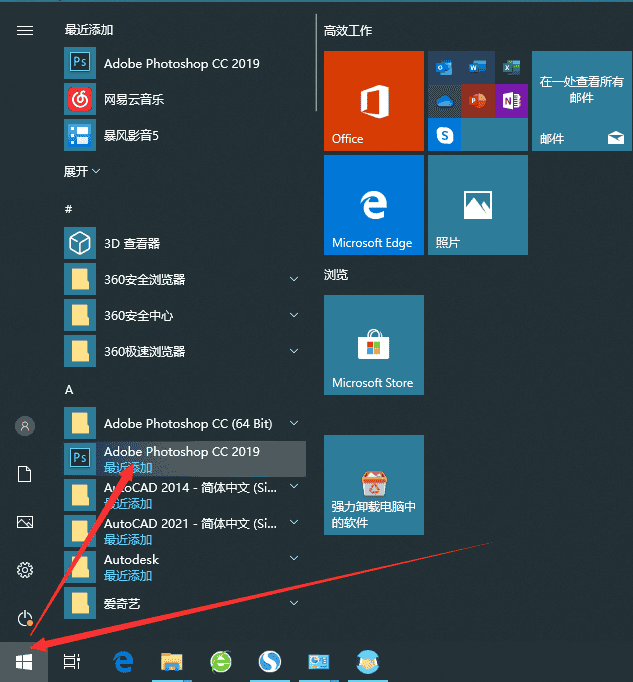 6、点击电脑左下角开始菜单,找到Ps2019点击启动即可。(启动后同样这个位置,鼠标右击软件发送到桌面快捷方式即可)