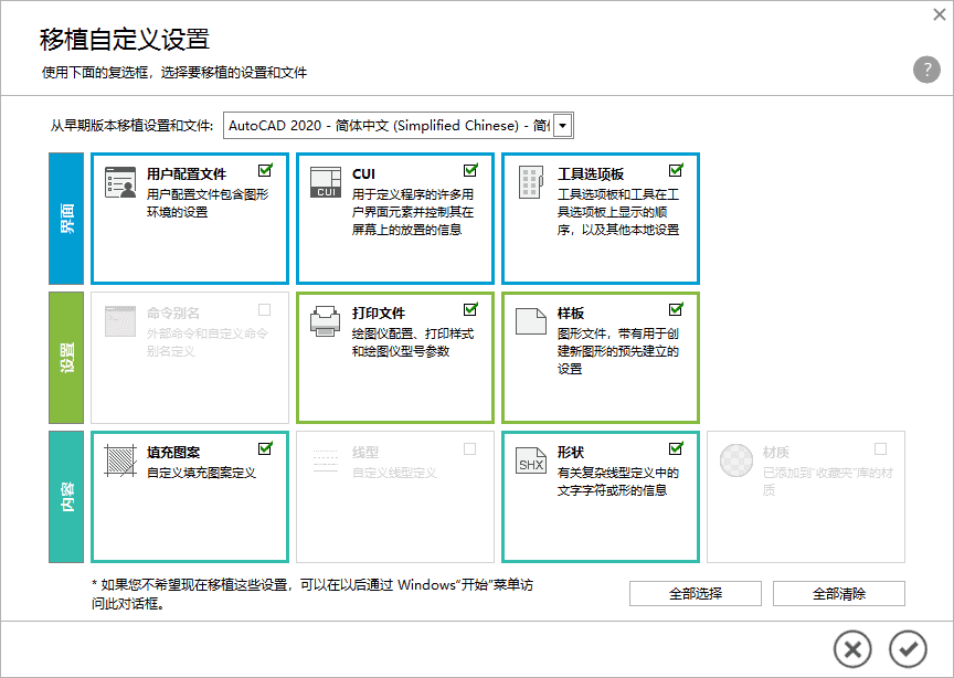 如果您之前安装过其他的版本CAD,就会有下面这个移植的提示,没的请忽略