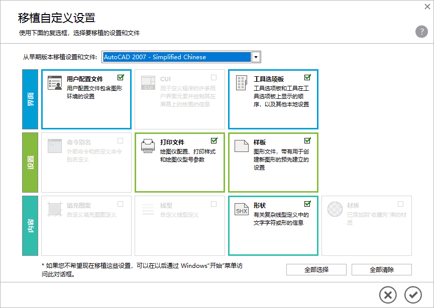 如果您之前安装过其他的版本CAD,可以选择需要移植的设置