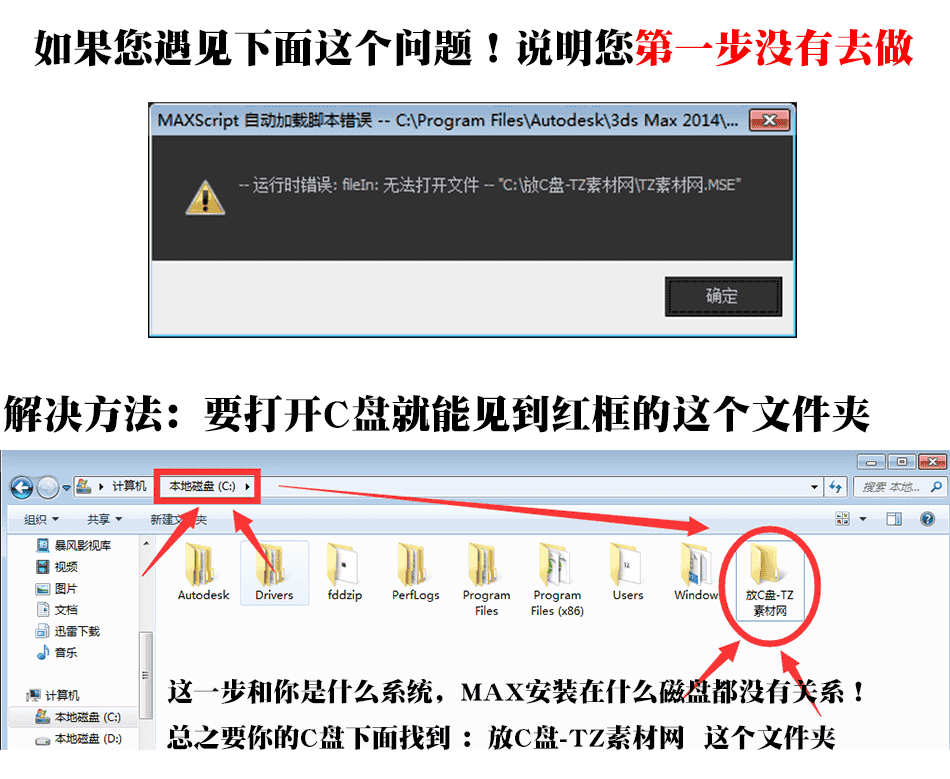 注意:必须直接打开C盘就能看见:“放C盘-TZ素材网”找个文件夹