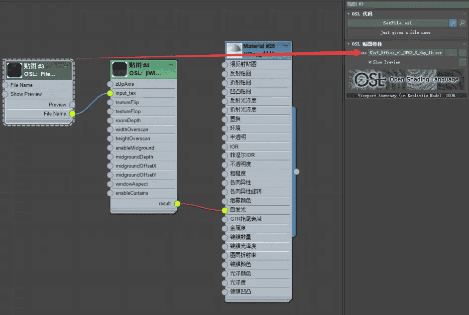 新建vray标准材质,按照下图连接至自发光通道:选择最左边的节点,载入下载的EXR贴图。